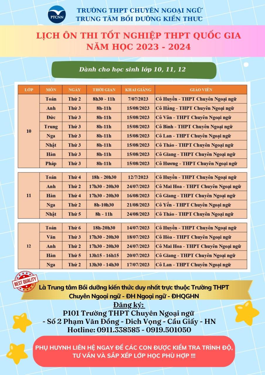 Để giúp học sinh đạt được kết quả cao trong kì thi THPT Quốc gia, Trung tâm CNN tập trung vào việc cung cấp một môi trường học tập chuyên nghiệp và các giáo viên có bề dày kinh nghiệm ôn thi trường THPT Chuyên Ngoại ngữ cũng như các trường khác. Với đội ngũ giáo viên gạo cội, chúng tôi sẽ giúp học sinh phát triển toàn diện các kỹ năng và kiến thức cần thiết để đạt được thành công trong kì thi THPT Quốc gia.